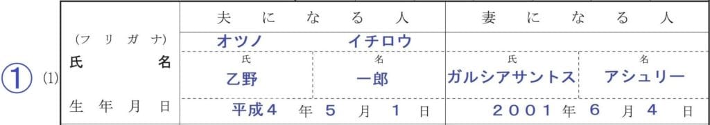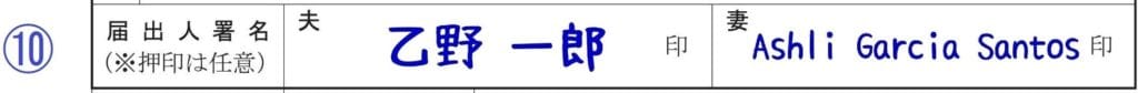 夫と妻の氏名を自筆で記入します。外国人はカタカナまたはアルファベット(ブロック体)で記入します。