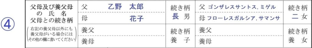 ④父母及び養父母の氏名、父母との続き柄